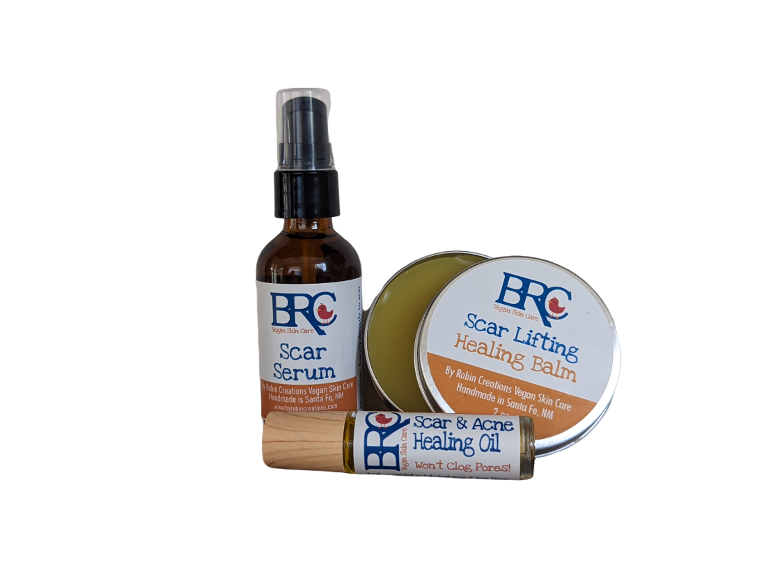 This Ultimate Scar Healing Bundle will fade and remove scars, scar tissue, acne scars, and other blemishes. 100% Naturally! It won't clog pores either! This set includes a 0.35 oz Scar & Acne Roll-on, a 2oz Scar Serum, and a 2 oz Scar Balm, all in an organza bag!