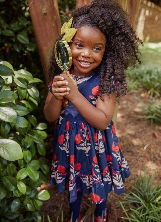 In an ode to Stacey's favorite childhood dress, this 100% dense cotton poplin Niley Dress mixes boho with a touch of girliness. We’ve added a sleeve for Fall to the same cropped silhouette as our Spring Niley Dress. Our team is obsessed with the oversized dandelion pattern in deep, rich Fall colors and you’ll love the ribbon detailing along a playful tier at the hem.